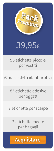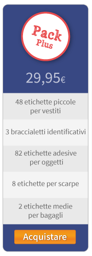 Il Pack Base include 48 etichette per vestiti, 82 per oggetti, 8 per scarpe e 2 per bagagli. È stato pensato per mettere il nome sui vestiti ed il materiale indispensabile. È perfetto per i bambini e le bambine già un po’ più grandi, che non hanno bisogno che assolutamente tutto abbia il proprio nome. Può inoltre essere utile anche per persone in degenza ospedaliera o in altri centri di residenza.